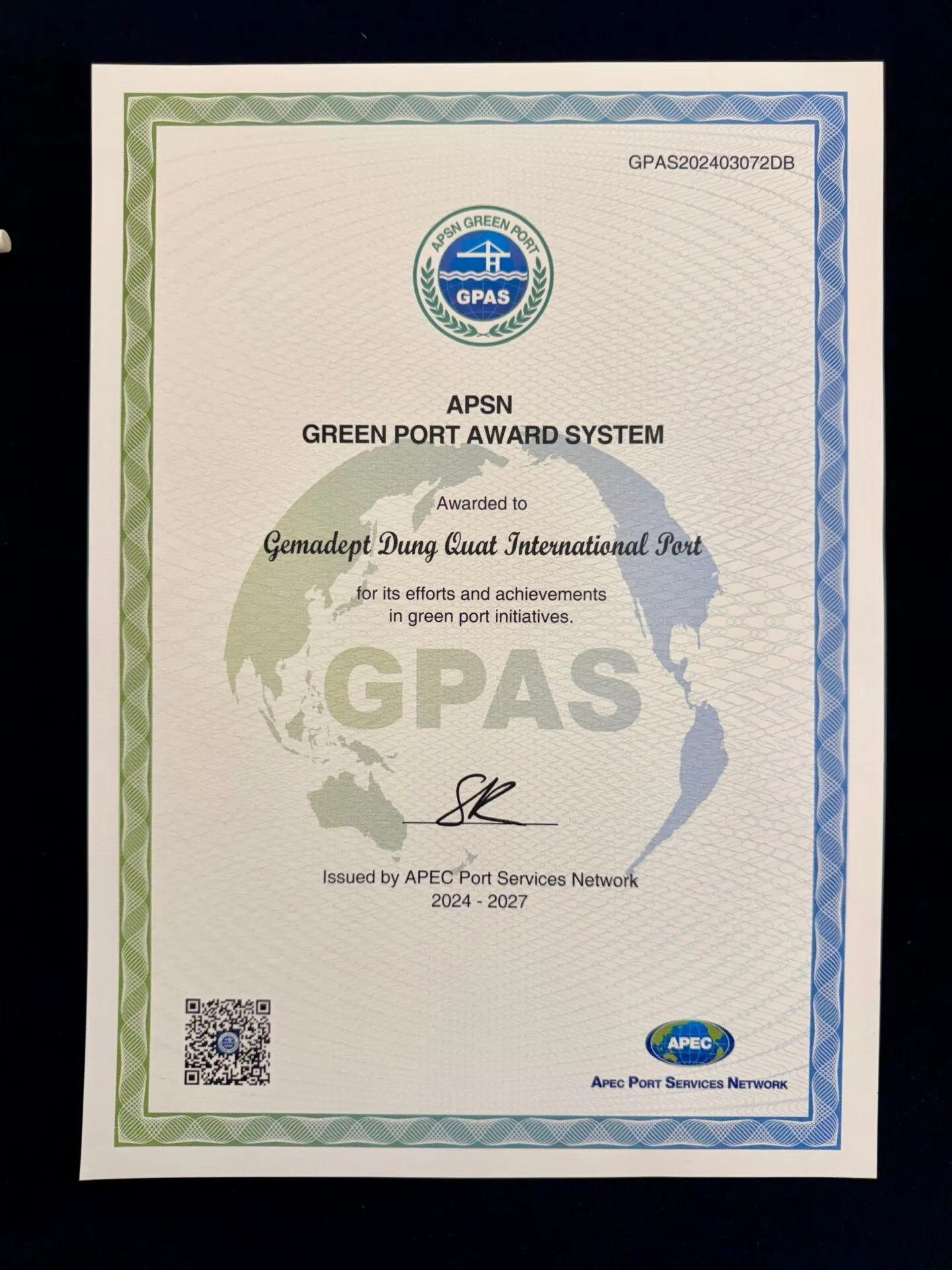 Sau quá trình đánh giá hoạt động trong 3 năm gần nhất, đại diện Mạng lưới Cảng biển Châu Á (APSN) đã trao tặng Giải thưởng GPAS 2024 cho Cảng Gemadept Dung Quất, cùng nhận giải có 11 đại diện khác, trong đó có nhiều tên tuổi lớn trên bản đồ cảng biển thế giới, có thể kể đến: Shandong Port Group Yantai Port West Port Area, Nansha Port Phase IV Fully Automated Terminal, Xiamen Ocean Gate Container Terminal, Bangkok Port, Johor Port…