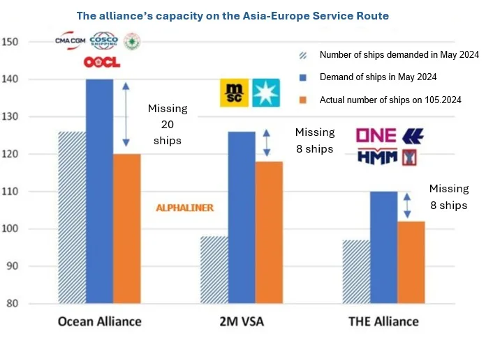 According to Alphaliner’s statistics, Shipping Line Alliances (LM) are operating 360 ships to serve transportation demands between Asia – Europe, as increasing market demand along with prolonged journeys to avoid the Red Sea cause a shortage of about 36 vessels in the market, including, LM Ocean Alliance will lack about 20 ships, 2M & The Alliance is expected to lack 8 vessels.