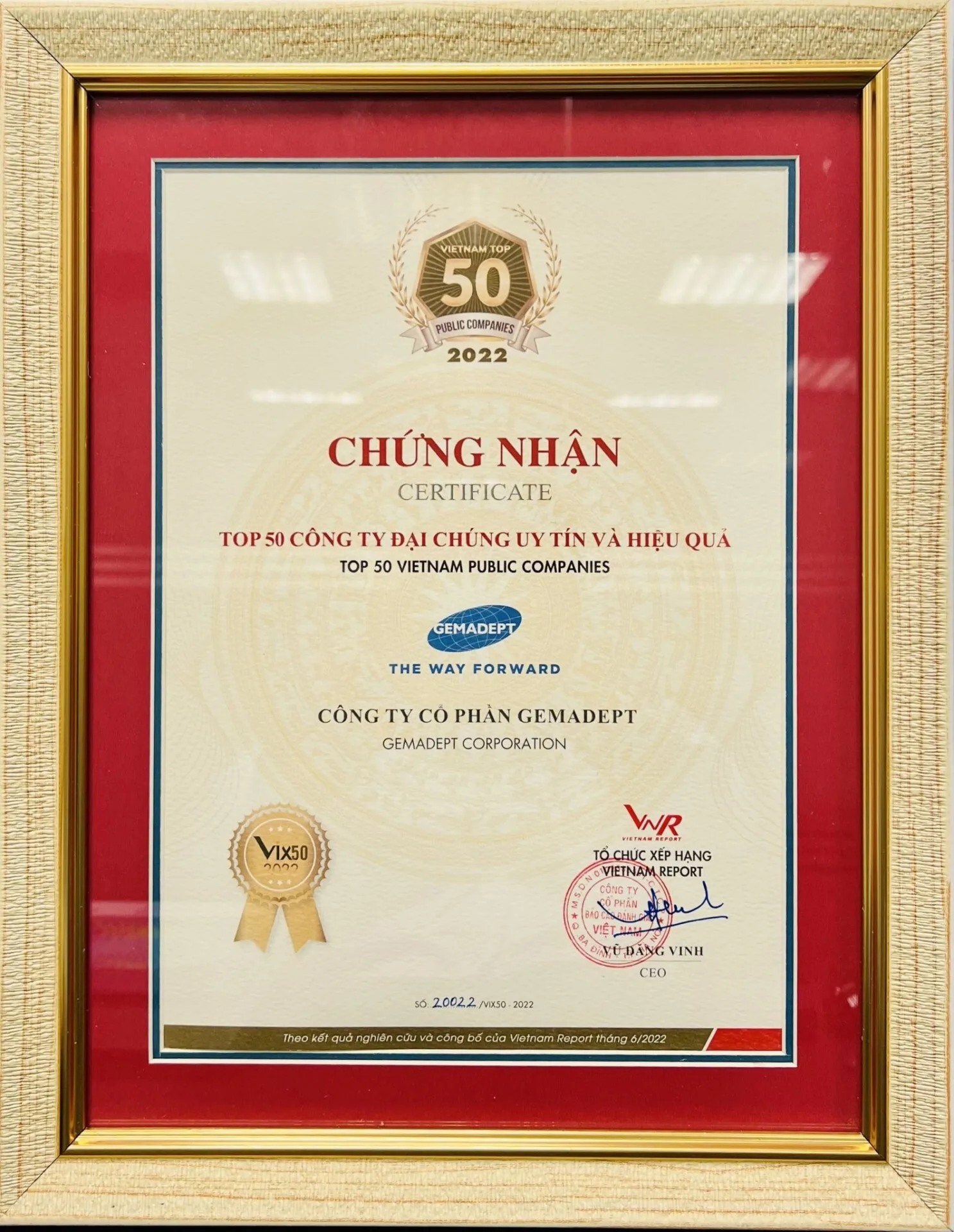 On June 3, 2022, Vietnam Report Joint Stock Company (Vietnam Report) officially announced the Top 50 Prestigious and Efficient Public Companies in 2022 (VIX50).